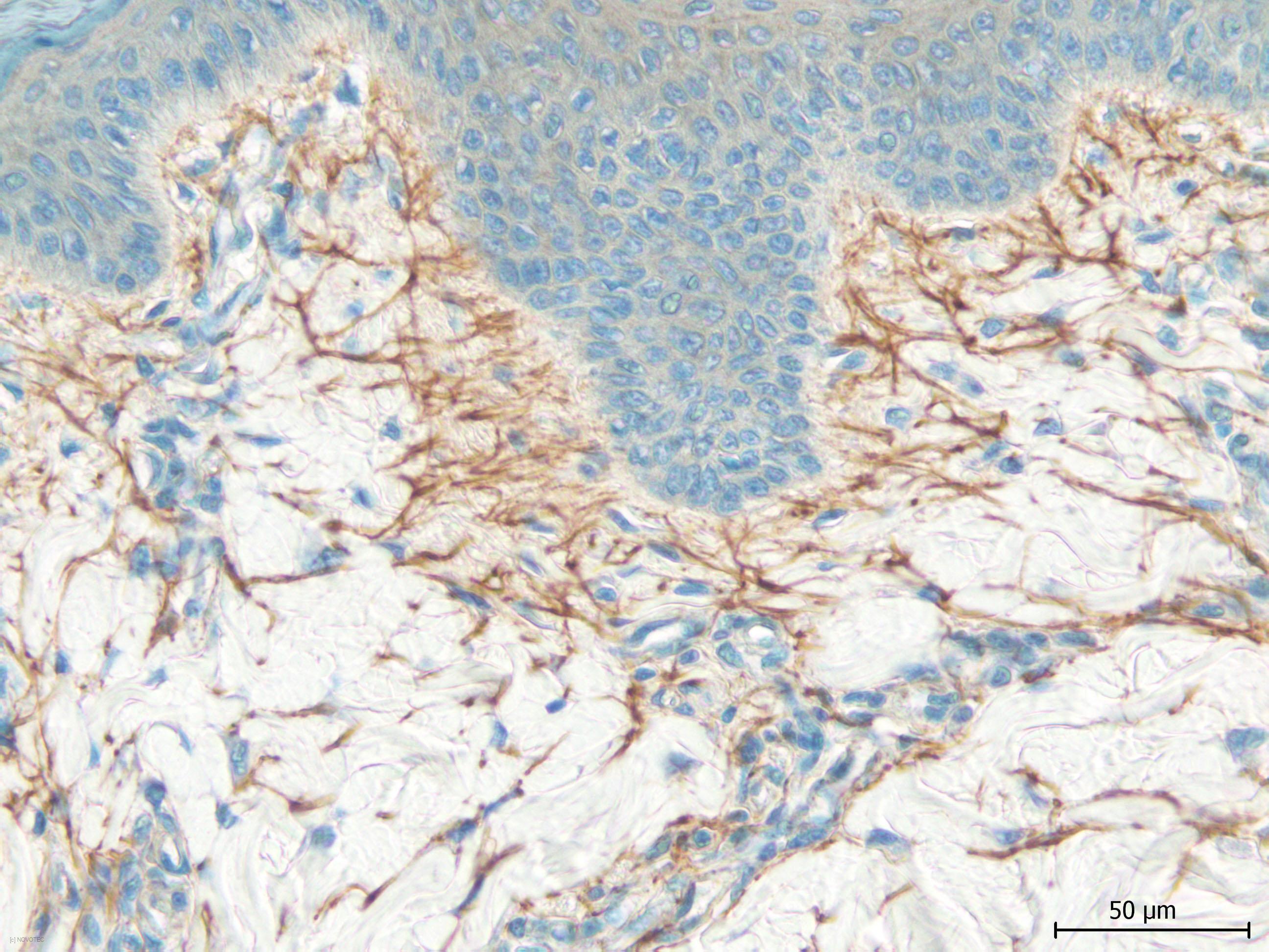 Immunoperoxidase technique with the Envision / Dako kit, 0.5% hyaluronidase pretreatment, optimal working dilution at 1/2000 on fixed paraffin-embedded porcine skin.